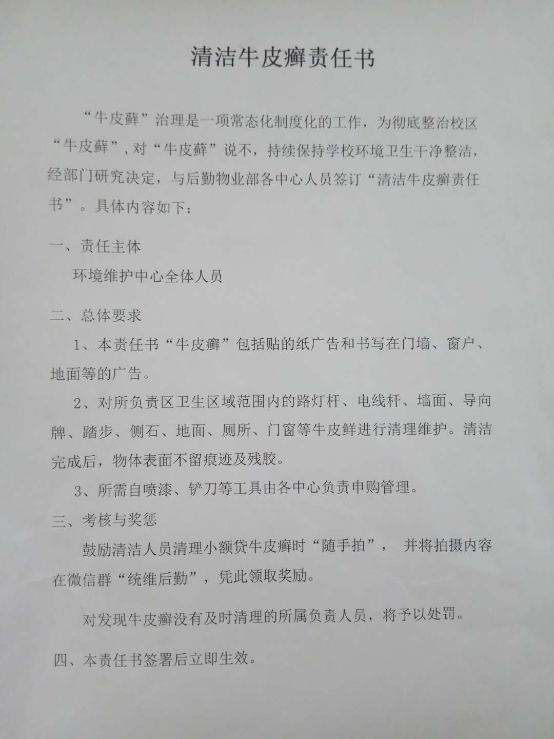 “牛皮癣”治理是一项常态化制度化的工作,后勤物业环境维护中心全体员工形成合力,配齐铲刀、喷漆等工具,划分各自负责的区域并签订 “清洁牛皮癣责任书”,明确奖罚。会后,对全校的路灯杆、电线杆、墙面、导向牌、踏步、侧石、地面、厕所、门窗等牛皮鲜进行清理维护。后勤物业环境维护中心及时发现,随时清理,责任到人,给师生创造干净、安全、和谐的校园环境。