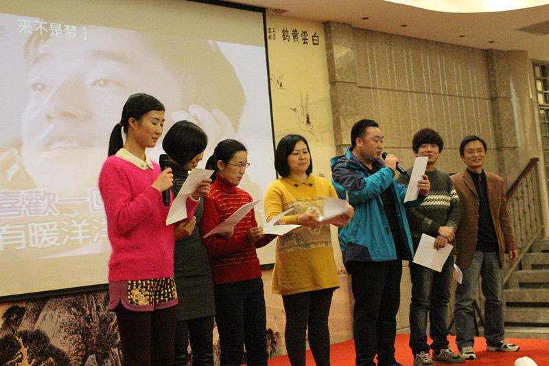 在随后进行的联欢活动中,文艺表演、互动游戏、现场抽奖轮番上演。经济与商务外语学院党总支副书记胡航与公共外语系教师鞠博演唱的歌曲《贝加尔湖畔》清新悠扬,拉开整场联欢活动的序幕;人事部部长亓小林演唱的歌曲《风吹麦浪》婉转动听,将观众带入秋日丰收的胜景;舞蹈《小苹果》、童声独唱及个人脱口秀三句半均由学院教职工子女表演,活泼可爱的孩子们将现场气氛推向高潮。穿插其中的游戏环节“报纸拔河”及“吸管传递”吸引了近30位老师踊跃登台。间隔举行的三轮现场抽奖更是激动人心,活动设三等奖3名、二等奖2名、一等奖1名,最终来自公共外语系的王凡老师拔得头筹。临近尾声,学院领导及教职工代表合唱歌曲《相亲相爱》,在一片欢乐祥和的气氛中,活动圆满结束。