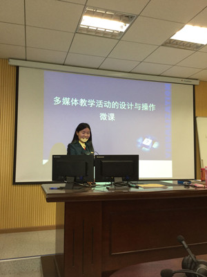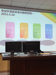 (经外院通讯员:黄净、郑鹰老师)4月17日下午2:10,经外院专业外语系“微课的设计与制作”教学研讨会在学校外语楼同声传译室召开。首先黄净主任对近期的相关工作做了总结和部署,会议其中一项就是有关2015年外研社“教学之星”大赛——微课与翻转课堂的章程介绍,并就此鼓励老师们积极报名参加比赛。因此随后的教研活动就围绕这一主题而展开,郑鹰老师做了一个题为“微课的设计与制作”的小型讲座。讲座围绕多媒体教学活动的设计与操作,介绍了微课概念、形式及特点,微课的设计工具与制作方法,并通过一些具体的案例使老师们从视角到思维方式等方面,带领大家走进微课程,探讨微课对教与学的意义。讲座内容详实丰富,与会老师饶有兴致参与讨论,现场气氛热烈。