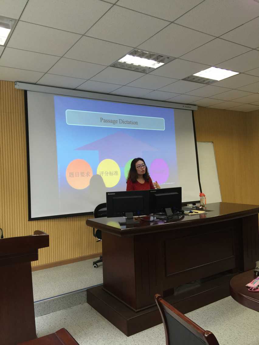 首先,熊奕老师介绍了英语专业四级考试卷面结构和考试分配时间。考试由六个部分构成,第一部分篇章听写(15分钟),第二部分听力理解(15分钟),第三部分完形填空(15分钟),第四部分词汇和语法(15分钟),第五部分阅读理解(25分钟),第六部分写作(45分钟)。专业四级备考教学计划主要有负责大学二年级综合应英语课程黄净和熊奕老师制定,并及时沟通随时进行相关协调。早在2014-2015第一学期,熊奕和黄净老师就会在每月的教学计划中加入针对考试题型的讲解和应试技巧训练,在课堂上严格控制学生的做题时间,监督学生提高做题效率,让学生们感受到考试日益临近的紧迫感。另一方面,熊奕老师也积极和学生沟通,主动了解复习过程中的种种疑惑和问题,介绍往届学生备考的经验方法和取得优异成绩,消除学生的顾虑,鼓励他们以师兄师姐为榜样,争取更大进步。