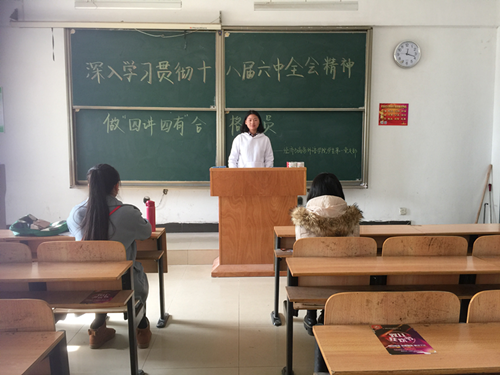 (通讯员:刘梦迪)2016年11月3日,我校经济与商务外语学院学生第一党支部为响应学校党委的号召,特开展“深入学习贯彻十八届六中全会精神做‘四讲四有’合格党员”党员学习会议。