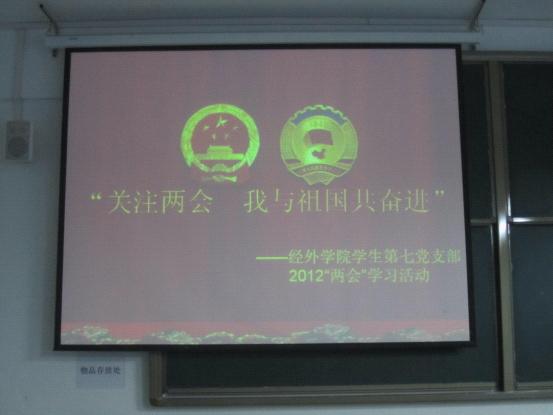 2012年3月15日晚,武汉长江工商学院经济与商务外语学院学生第七党支部开展了“关注两会 我与祖国共奋进”的2012“两会”学习活动。