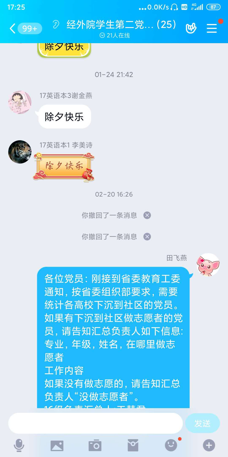 定期在网上询问学生党员的情况,提醒大家做好个人防护安全措施,了解大家的现状,相互打气。了解到16级毕业生党员部分在企业进行实习,17级学生党员、18级学生党员也充分做好个人防护。通过日常沟通了解党员的基本情况。