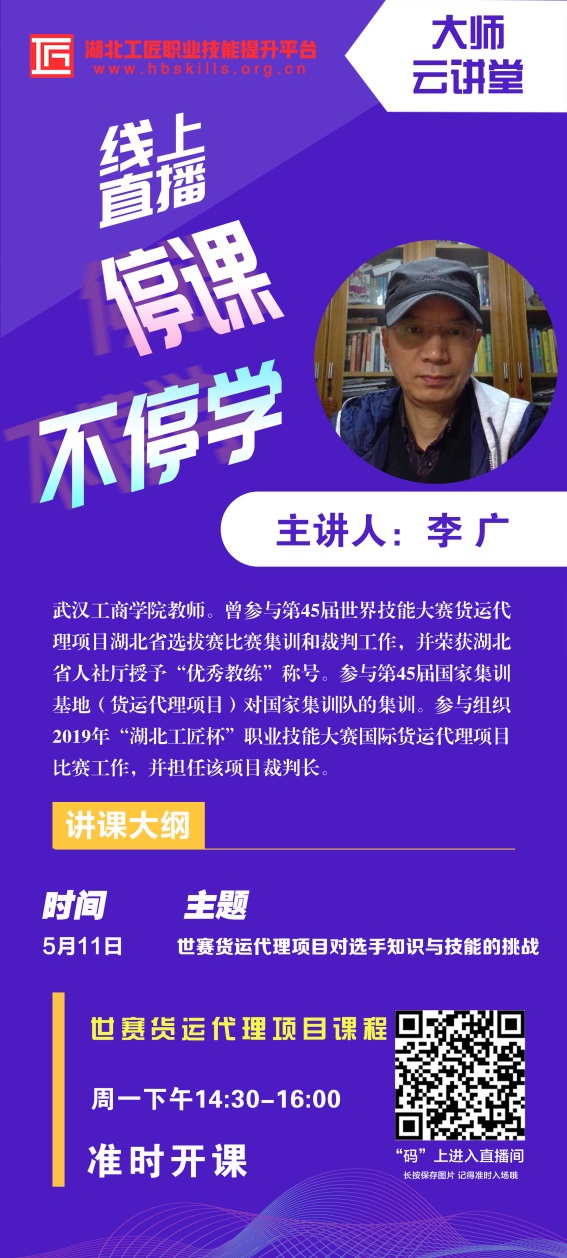2020年5月11日,必赢优惠y272net经济与商务外语学院教师李广担任“湖北工匠大师公开课”讲师,公开讲授“世赛货代项目对选手知识与技能的挑战”。