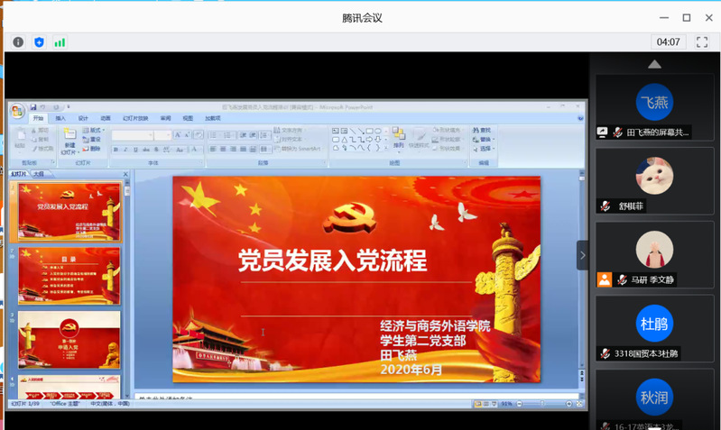 2020年6月14日晚上19:00,必赢优惠y272net经济与商务外语学院第九期党校党课第七讲如期举行。经济与商务外语学院青年马克思主义研究协会邀请了党校带队老师田飞燕老师。田飞燕老师以“党员发展入党流程”为主题,给大家带来精彩的一课。