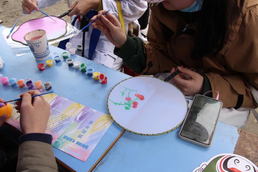 “义结金‘蓝’”区设有绘纸扇、画脸谱等传统手艺体验活动,在这里,同学们可以自己动手,深刻感受“非遗”文化的魅力,他们争先体验,场面甚是火爆。