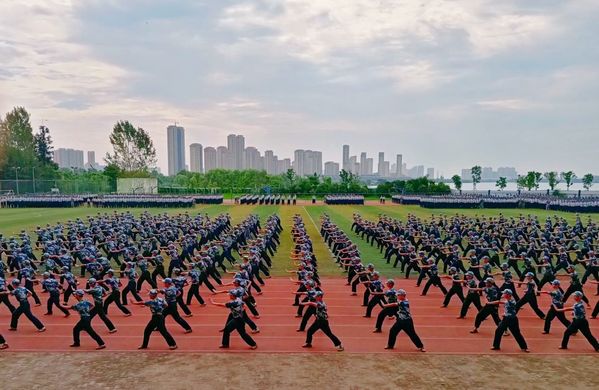 大会在雄壮嘹亮的国歌声中拉开帷幕,各队列方阵依次走过主席台,他们精神抖擞、步伐整齐、口号嘹亮,展现出了当代青年的热血与朝气。由400余名男生组成的擒敌拳方阵表演,大家身姿矫健、动作敏捷、气势磅礴,一招一式尽显军人风采;1300余名女生组成的花样方阵带来了精彩纷呈的表演,大家齐声高唱《没有共产党就没有新中国》,并通过队形不断变化和手语操,依次呈现出“神州12号”“党徽”“建党100”“中国地图”“中国”“工商”“2021”等图案,深情献礼建党100周年,赢得了现场阵阵热烈掌声。