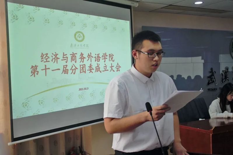 本次会议由学生会秘书处部长苏鹏主持,宣读本场会议的要求和纪律,并在介绍到场的人员后,经济与商务外语学院分团委成立大会正式开始!