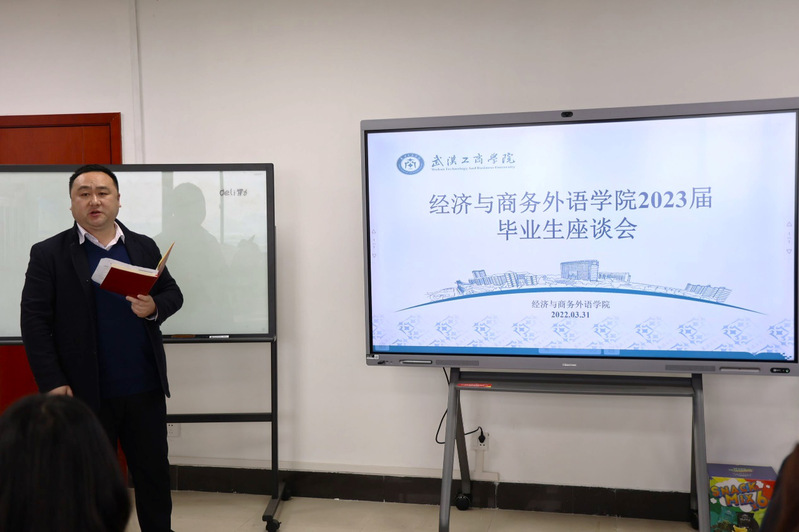3月31日下午2时,经济与商务外语学院2023届毕业生座谈会在综合楼904会议室召开。经济与商务外语学院党总支书记胡航,分团委书记徐可,辅导员陈桂华、凡萌、甘甜等老师与同学们一起座谈交流。会议由胡航老师主持。