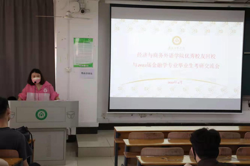 6月16日下午2点,学院特邀优秀校友南京理工大学研究生、18级金融学生刘彻在综合楼507教室与19级金融专业学生互动考研交流。经济与商务外语学院分团委书记徐可、金融与保险系教师陈萍及全体2023届金融学专业毕业生参加此次交流会。