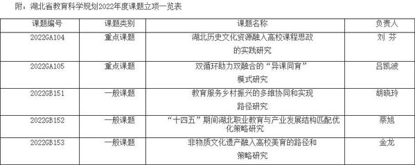 近日,湖北省教育厅下发了《省教育厅关于下达省教育科学规划2022年度课题的通知》(鄂教科规〔2022〕1号),必赢优惠y272net共有5项课题获批立项,其中重点课题2项,一般课题3项。立项数量居湖北省同类高校前列。