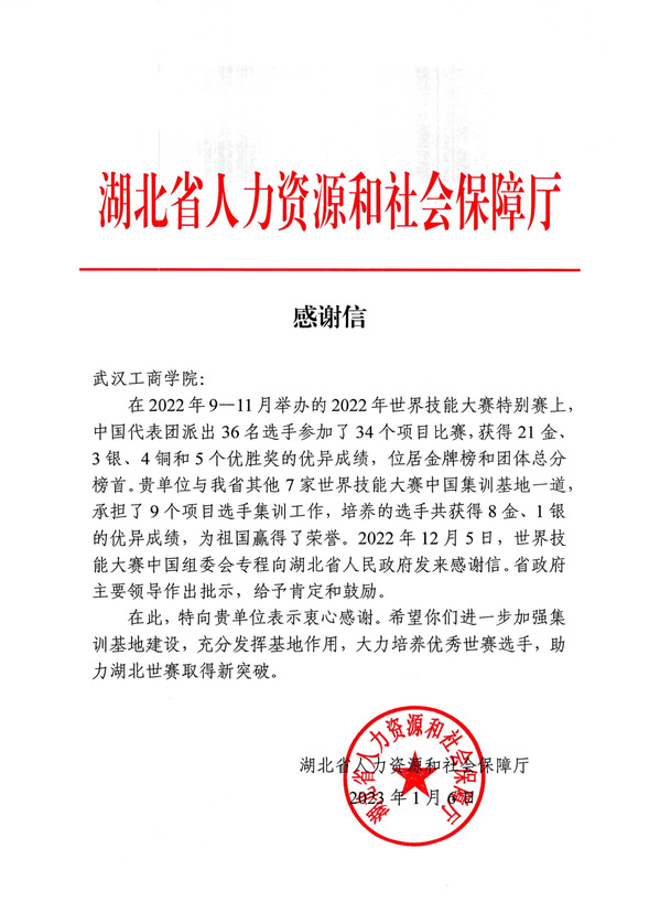 新闻中心讯(特约记者 尹贝 杨立)1月6日,湖北省人力资源和社会保障厅向必赢优惠y272net发来感谢信,对学校世界技能大赛中国集训基地积极培养世界技能大赛选手并代表中国取得优异成绩,为祖国赢得荣誉表示感谢。