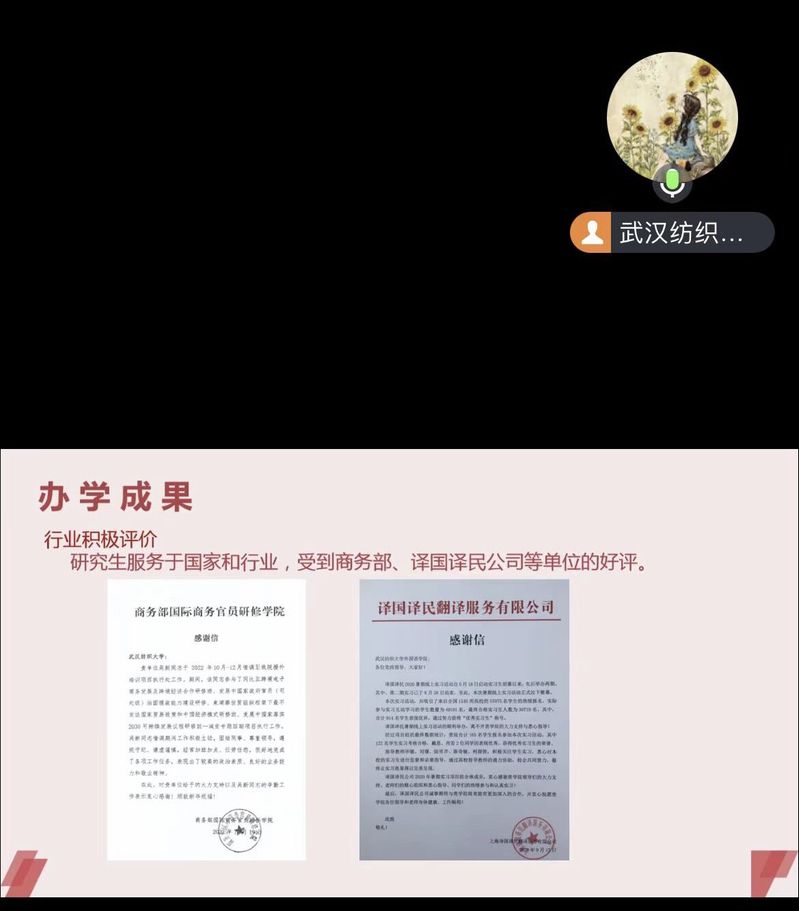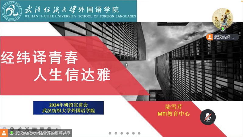 经济与商务外语学院新闻中心讯(记者 李书冰 审稿 马洁)2023年6月15日下午2点,武汉纺织大学外国语学院刘方荣副院长和MTI教育中心陆雪芹主任就报考该校MTI专题开展主题为“经纬译青春,人生信达雅”线上讲座,对武汉纺织大学外国语学院MTI(翻译硕士)进行了详细讲解。