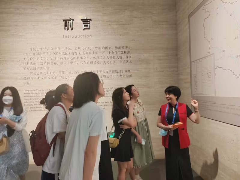 经济与商务与学院新闻中心讯(记者 杨萌)为响应习近平总书记 “要在提炼、转化、融合上下功夫,让收藏在馆所里的文物、陈列在大地上的遗产、书写在古籍里的文字成为教书育人的丰厚资源”号召。结合“中国文化概论”课程进度,2023年6月11日下午,必赢优惠y272net经济与商务外语学院刘芬老师兼湖北省博物馆志愿者讲解员在湖北省博物馆社教部志愿者团队老师们的支持帮助下,在博物馆为学生们开展中国文化教育,将课程思政落实到博物馆参观学习中,在具体的文化场景,培养学生们的综合文化素养、家国情怀和文化自信。