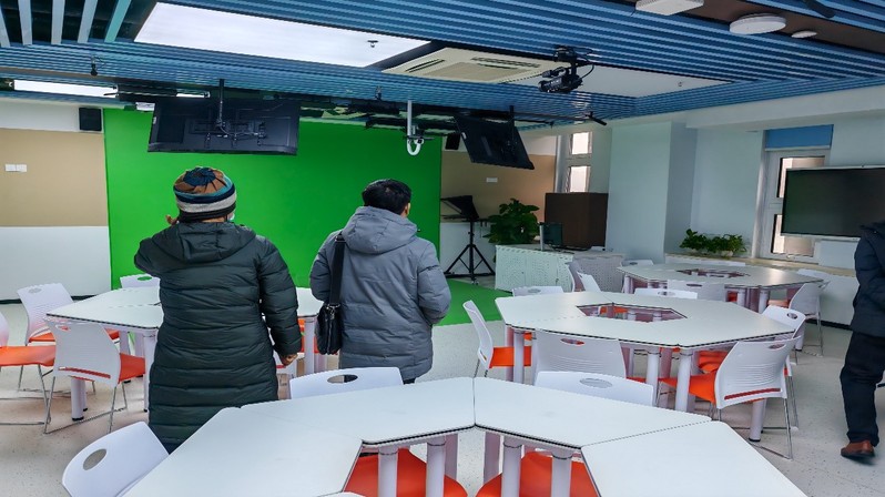 2024年1月2日,我校实验教学中心颜爱国副主任兼教务部副部长、经济与商务外语学院马洁副院长、外语实验室王志华老师一行在中国地质大学省级语言示范中心董成见主任的带领下,参观调研了语言实验室、高清录播室、虚拟仿真微课制作实验室、雅思中心等。