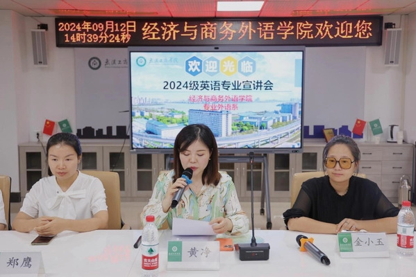 图为经济与商务外语学院英语系主任黄净教授做专业介绍