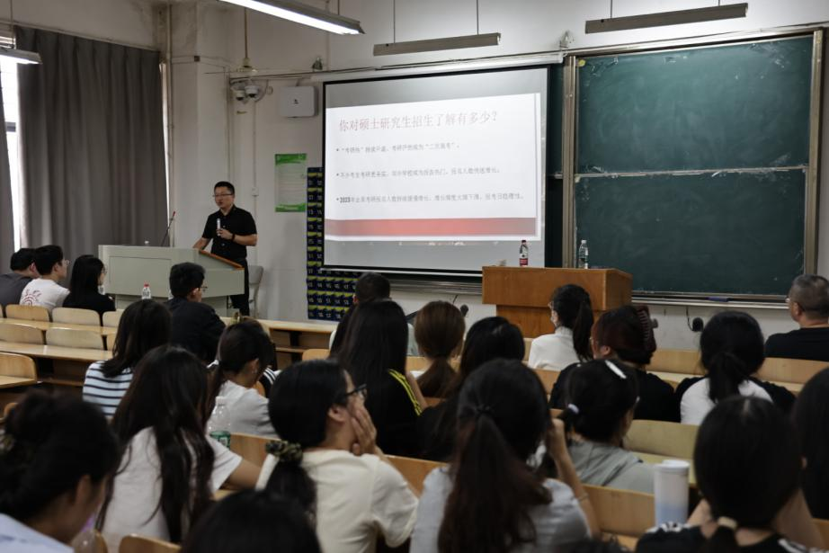接着,牛教授为同学们介绍了考研信息填报的注意事项,并鼓励他们清晰自我定位,合理报考院校。他还客观分析了当前的考研形势,并介绍了江汉大学外国语学院的学位点及培养成效,针对性的介绍了本校的招考专业和备考准备工作。对于如何选专业、合理规划、保持健康心态等问题,牛教授为同学们答疑解惑,为他们指明了前进的方向。他不仅分享了考研的经验与备考策略,还告诫同学们应当坚定信念,保持积极的心态追逐梦想。同学们纷纷表示,此次讲座让他们对考研有了更加清晰的认识。