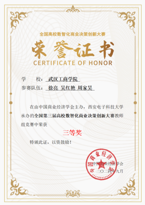 经济与商务外语学院新闻中心讯(记者:莫雨)近日,由中国商业经济学会主办的全国第三届高校数智化商业决策创新大赛教师组全国总决赛圆满落幕。经过激烈角逐,我校经济与商务外语学院国际经济与贸易专业的教师宝雪荣获全国第三届高校数智化商业决策创新大赛教师组全国总决赛数智模拟经营模块二等奖。金融学专业的教师徐亮和吴红艳组成的参赛团队荣获全国第三届高校数智化商业决策创新大赛教师组全国总决赛教学应用创新模块三等奖。