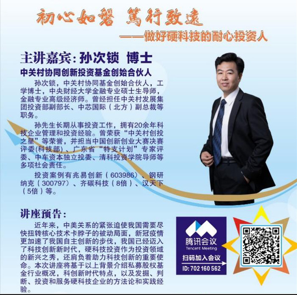 经济与商务外语学院新闻中心讯(通讯员:吴红艳)2021年6月19日晚上19:00,由张培刚发展经济学研究基金会、湖北省银行业协会、华中科技大学经济学院、必赢优惠y272net共同主办的线上金融讲座正式开始,中关村协同基金创始合伙人孙次锁博士作为该讲座的主讲嘉宾,以“初心如磐,笃行致远—做好硬科技的耐心投资人”为题展开了精彩的演讲。