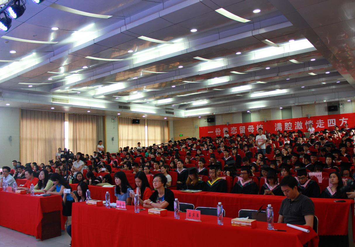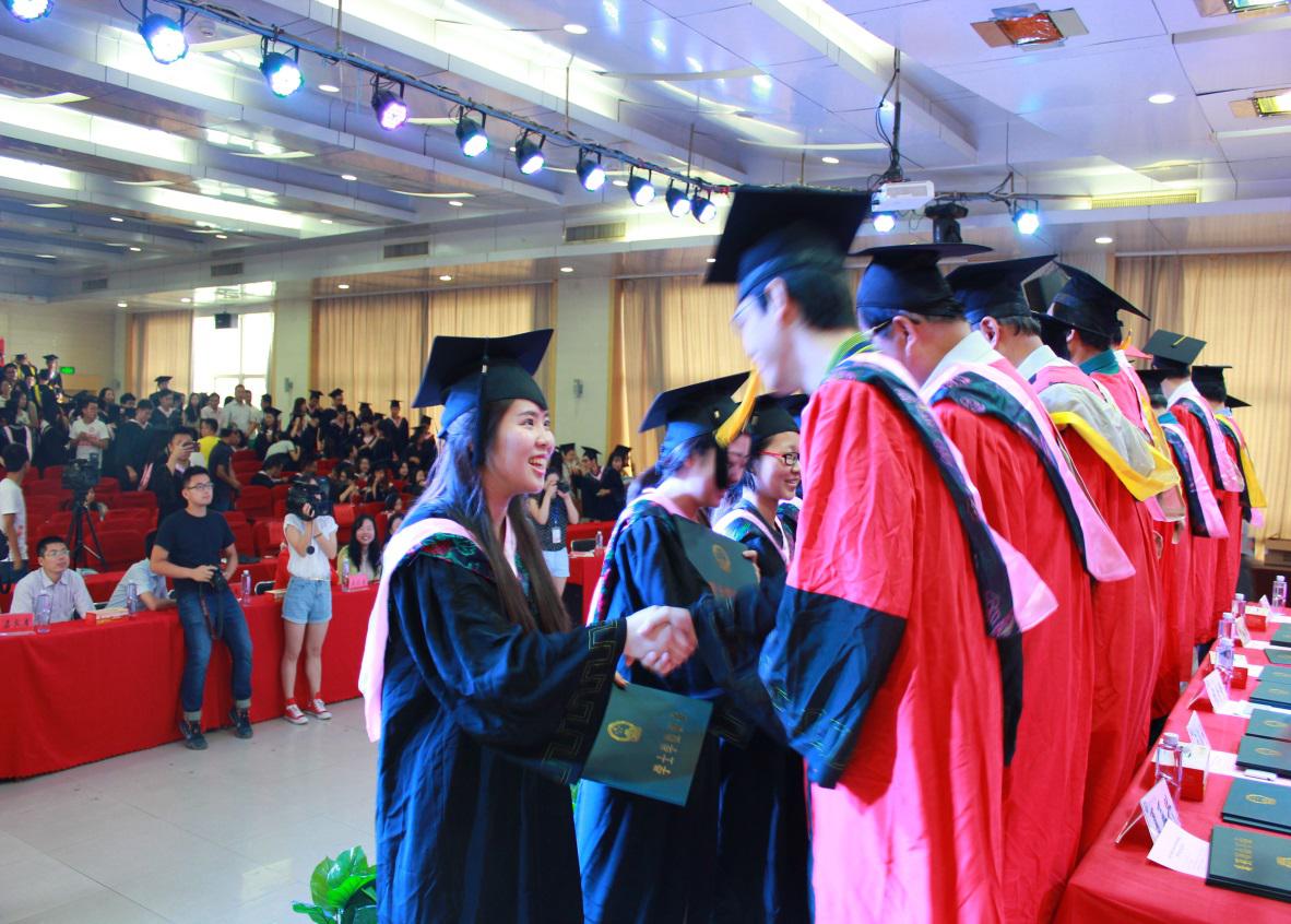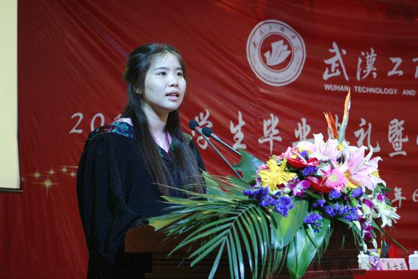 毕业生代表曾庆媛代表毕业生发言。七月她即将奔赴世界排名前20的悉尼大学开始研究生生涯。她向大家分享了自己充实而又难忘的大学时光,并对学校、老师、同学表达了真挚的感谢,她感慨地说:“在学校我们完成了知识上的启蒙,收获了人生第一笔财富,这里有认真负责的学校领导和可爱的老师,他们对我们无微不至的关怀和照顾是我大学最难忘的记忆,今天我们毕业了,虽然内心万分不舍,但是我们不得不选择留恋、放手,满怀梦想追求未知的未来。”