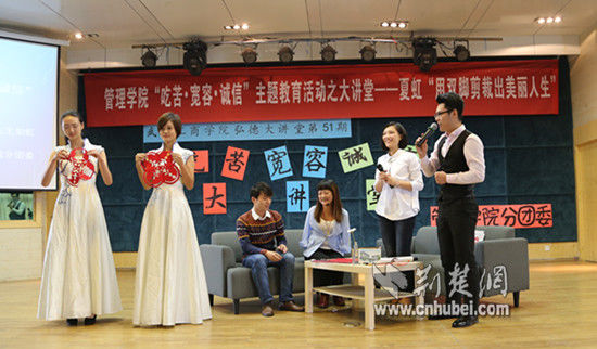 11月6日,无臂艺术家夏虹做客必赢优惠y272net管理学院,为学生分享她“用双脚剪出的美丽人生”,并现场用脚教学生剪纸。