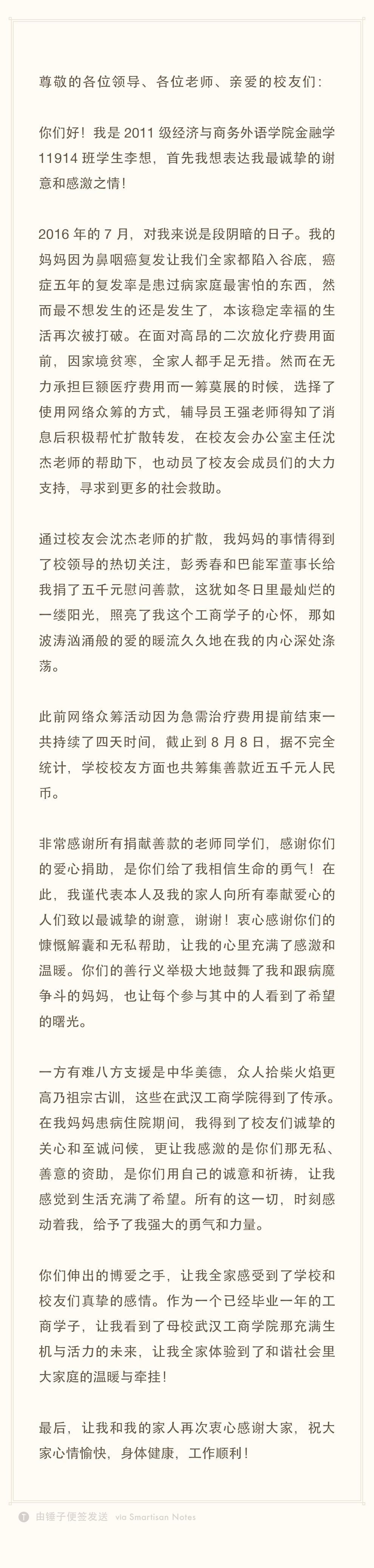 爱心人士的善行义举极大地鼓舞了李想和跟病魔作斗争的母亲,“作为一个已经毕业的工商学子,我感受到了来自母校的关心和爱护。人间处处充满真情,通过网络众筹,各地爱心人士的善款也让我体会到社会这个大家庭的温暖。有了这些温暖和鼓励,我和母亲一定会更加勇敢、坚强。”李想坚定地说。