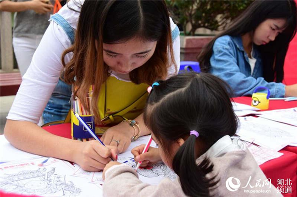 图为学生在现场教市民填色 (熊名扬 摄)
