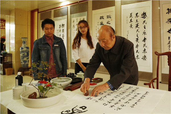 上午11:00,该校顾问陶梅生教授也来到现场挥毫泼墨。“浮舟沧海,立马昆仑”“博观约取”……陶梅生教授运用金文和行书现场题字,其书法厚重有力又不失清秀,给人以视觉的冲击,并教在场的学生在书法中应该如何书法运笔和行款、钤章。“书法运笔的方法有逆锋起笔、中锋行笔、转笔等,全身的力量通过手臂、手腕,到达笔尖,手腕的力量尤其重要。书法作品上的印章,是作品中不可缺少的组成部分。印章有闲章和姓名之分,不仅能使书法作品增色,起到‘锦上添花’的效果,而且能调整重心,是作品布局上必不可少的部分。”陶教授对现场的学生说道。