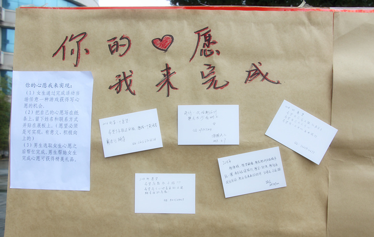 在许愿墙前,女生们陆续写下自己的愿望或祝福,公开贴在留言板上,“希望有人清空我的购物车”“带我吃家乡美食”“找个学霸帮我辅导英语四级”“最重要的是脱单”等等。2017级环境与生物工程学院环境监测专业胡蕾说:“很开心,其实我们周围的男同学平时也都很绅士,很关心女生,感觉每天都是女生节。”