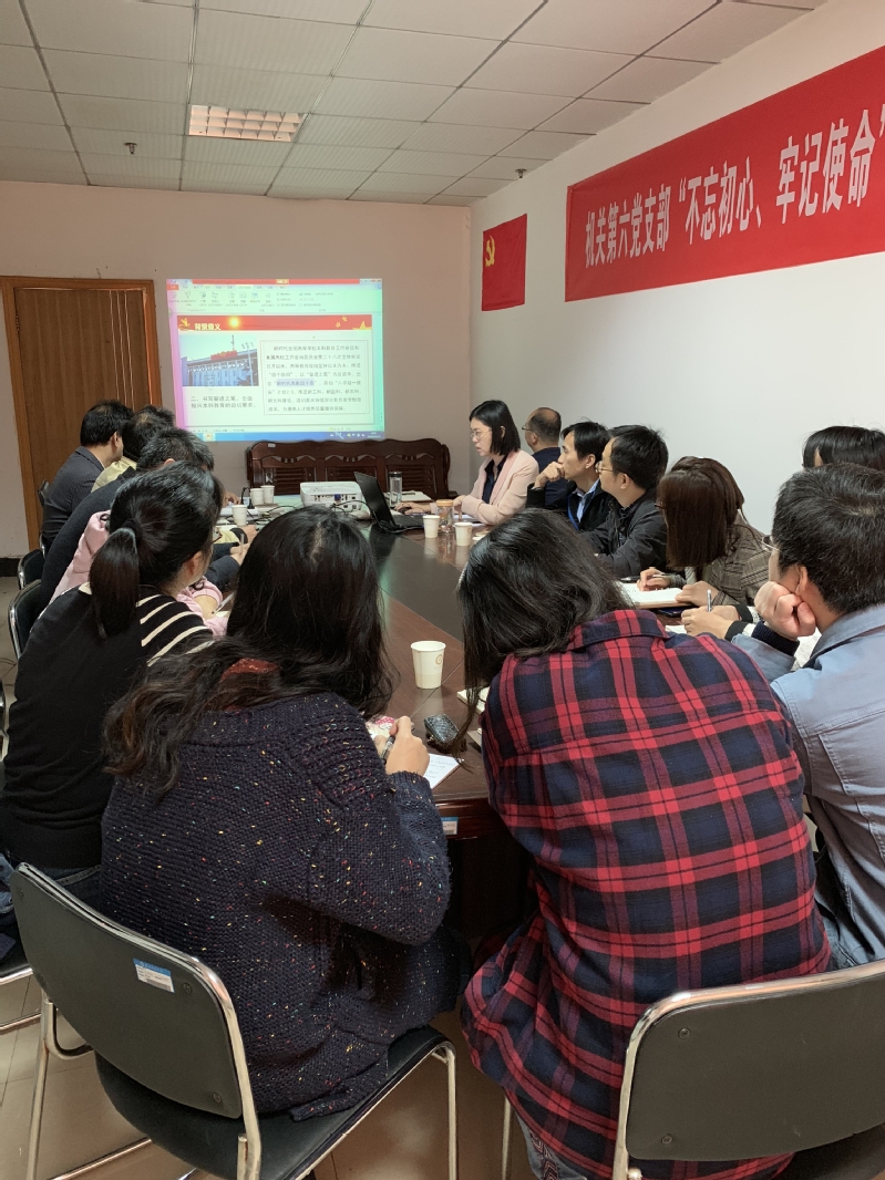 直属第六党支部成立后,为深入学习贯彻习近平新时代中国特色社会主义思想,切实践行“守初心、担使命、找差距、抓落实”的总体要求,10月18日上午,亓小林书记按照政治学习计划亲自组织全体党员进行集中政治学习,并对大家提出了“加强政治理论学习,保持清楚政治头脑,立足岗位履职尽责”的要求。会上,亓书记还组织大家学习了《关于深化本科教育教学改革,全面提高人才培养质量的意见》,分别从文件出台背景意义、严格教育教学管理、深化教育教学改革、引导教师潜心育人、加强组织保障等五个方面给大家进行了文件解读,同时引导大家结合本职工作进行了深入思考和讨论,大大增强了全体党员的职业使命感和工作责任心,为完成本年度的各项工作打下了思想基础。