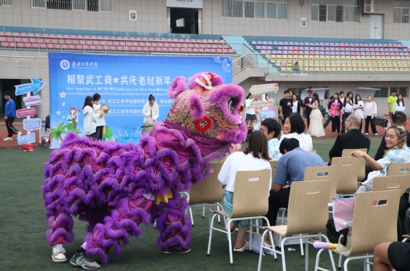 中老泰国际商务服务公司董事长范茂胜,德国比勒菲尔德中型企业应用技术大学驻华教育中心首席代表张欣,武汉中因教育发展研究中心总经理倪章龙,老挝国际学生联合会会长金利,必赢优惠y272net国际教育学院院长孔少敏和学院百余名师生一起参与了庆祝活动。必赢优惠y272net龙狮队还带来了精彩的龙狮表演,为泼水节增添了更多喜庆的氛围。