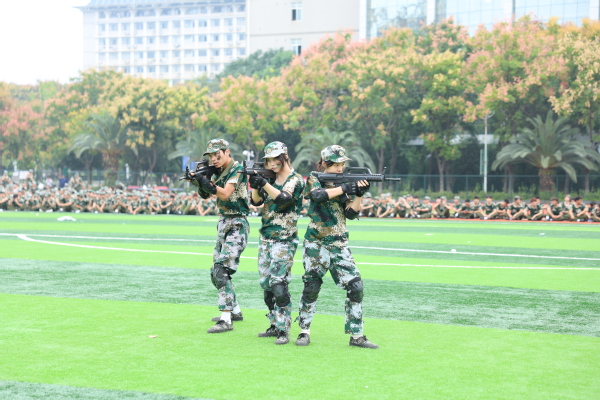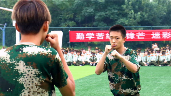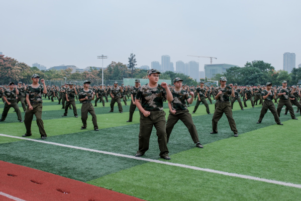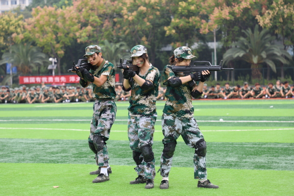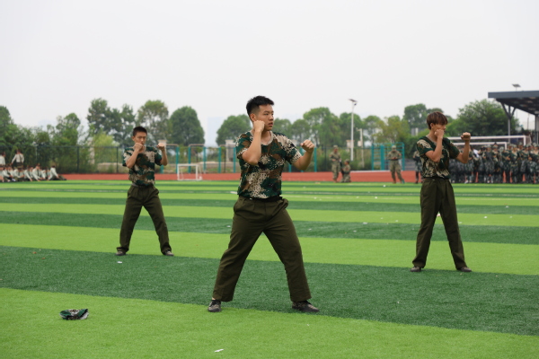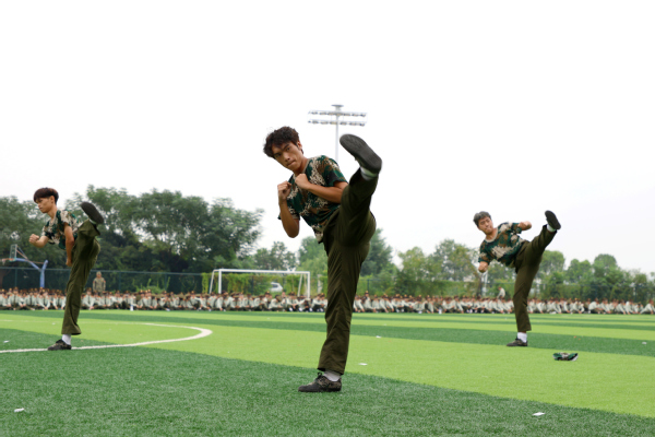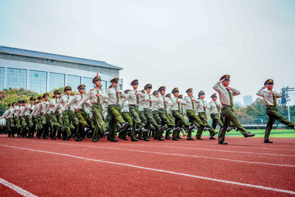 拳术方队的表演点燃全场激情。队员们目光如炬,神采奕奕。冲拳、弹腿、格挡,动作刚劲有力,整齐划一;转身、腾挪、收势,姿态利落干脆,充满力量,充分展现了新生们经过军训锻炼后坚韧不拔的意志和过硬的军事素养。