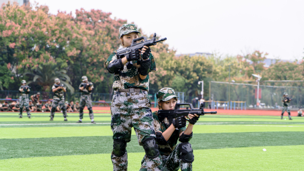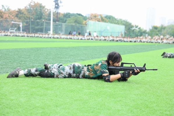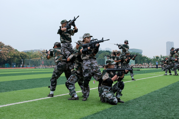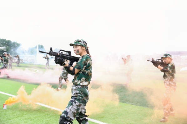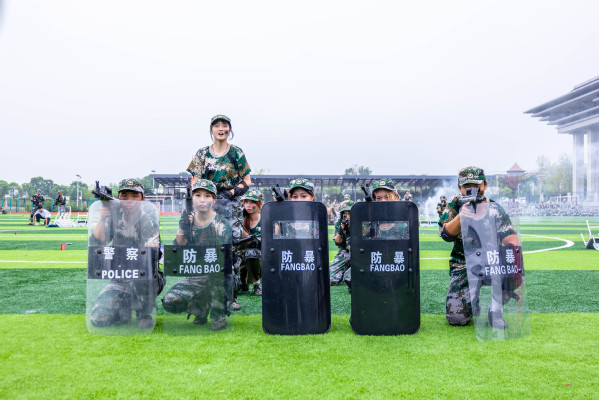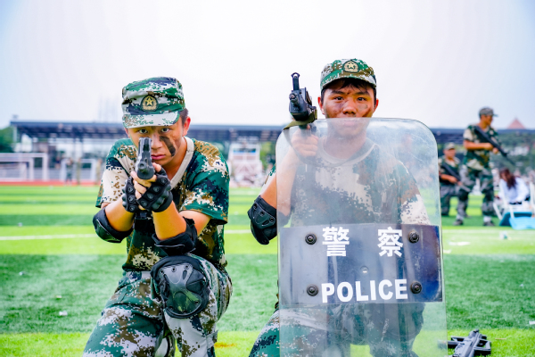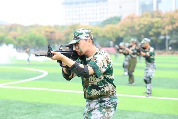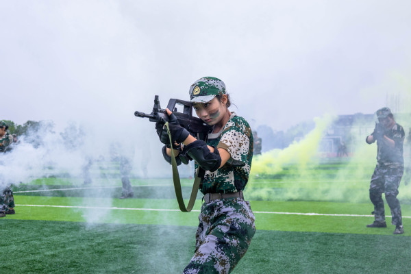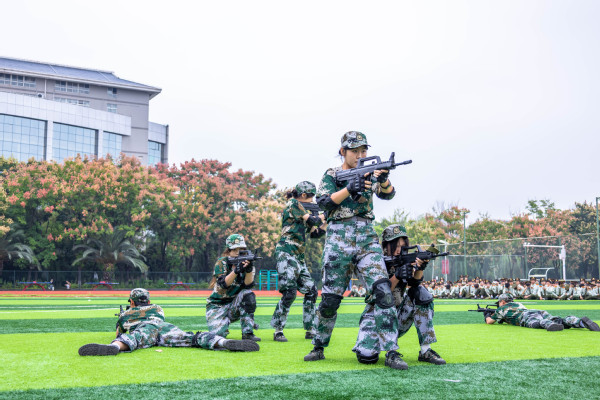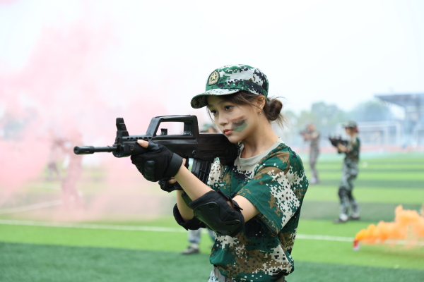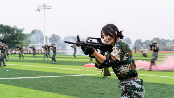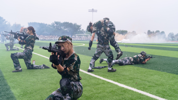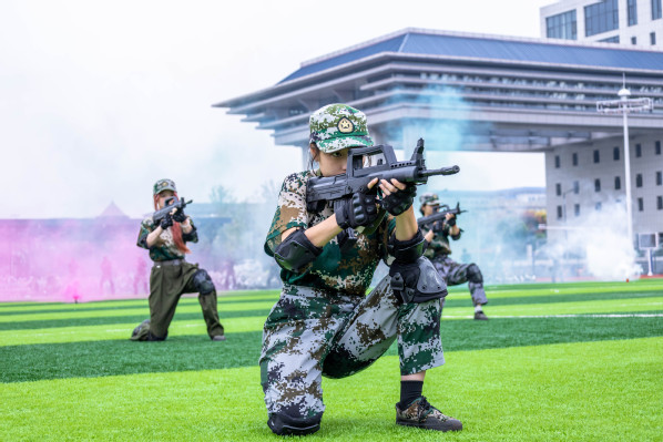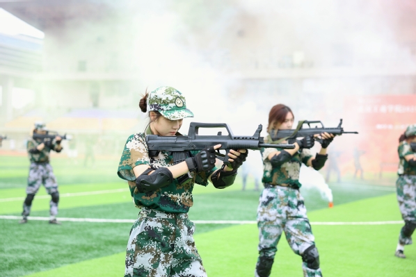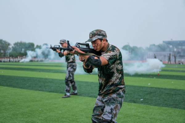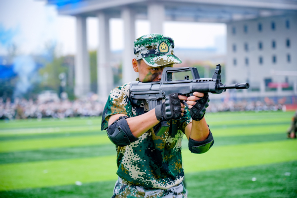 压轴登场的是战术方队。他们目光坚定,手持“钢枪”,在模拟的战场硝烟中,进行了一场融合战术队形变换与基础战术动作的实战化演练。队员们行动敏捷,配合默契,冲锋、掩护、搜索、突击,每一个环节都紧张逼真,展现出了良好的战术素养和团队协作精神,赢得了现场阵阵热烈的掌声。