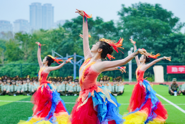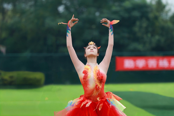 伴随着悠扬而富有动感的旋律,14名舞蹈表演专业学生翩然登场,再现了今年学校舞蹈表演专业学生参演的央视春晚同款舞蹈——凤凰舞。她们足尖轻点,旋转时裙摆如凤凰振翅般绚烂绽放,又似凤凰浴火重生般充满力量。灵动的舞姿将凤凰涅槃的壮美演绎得淋漓尽致,寓意2025级新生将在大学这个新起点展翅高飞,书写人生华彩篇章。