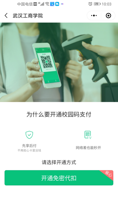 6.首次使用校园码需要开通支付功能,开通后即可点击“刷校园码”进行支付。