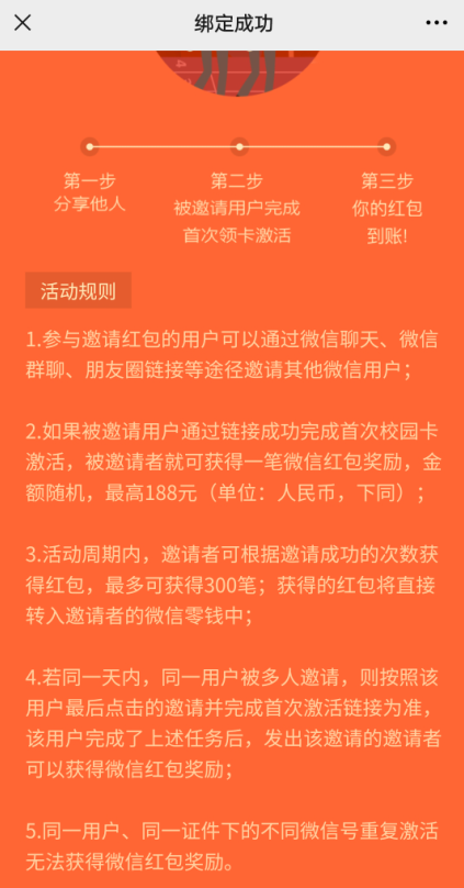7.推广期间活动,领卡并激活成功可获得随机现金红包。注:只有本校师生才可完成认证激活。