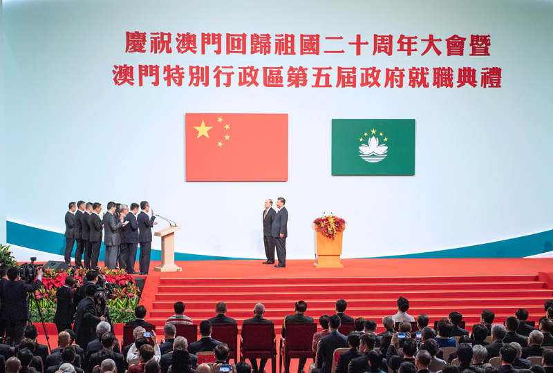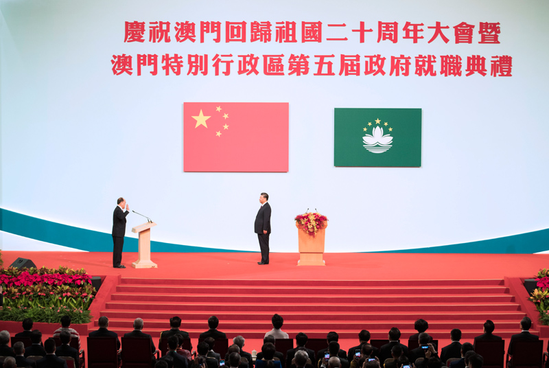 12月20日,庆祝澳门回归祖国20周年大会暨澳门特别行政区第五届政府就职典礼在澳门东亚运动会体育馆隆重举行。中共中央总书记、国家主席、中央军委主席习近平出席并发表重要讲话。由习近平监誓,澳门特别行政区第五届政府主要官员在澳门特区第五任行政长官贺一诚带领下宣誓就职。