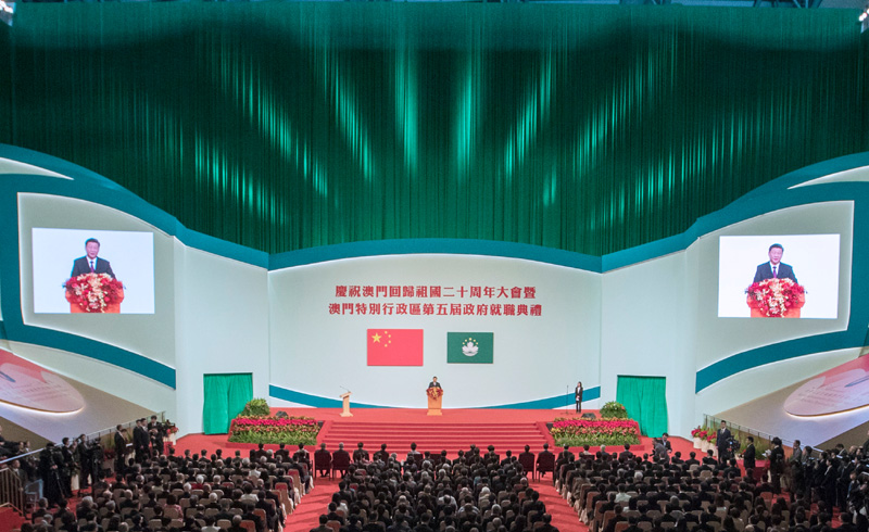 12月20日,庆祝澳门回归祖国20周年大会暨澳门特别行政区第五届政府就职典礼在澳门东亚运动会体育馆隆重举行。中共中央总书记、国家主席、中央军委主席习近平出席并发表重要讲话。
