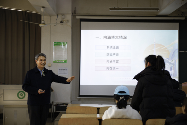 “习近平新时代中国特色社会主义思想是内涵丰富、系统完备、逻辑严密的思想体系,同学们要学会归纳总结,深刻领会其中蕴含的鲜明立场、观点和方法,做到学用结合、学以致用,从中汲取前进的智慧和力量,把学习成效转化为走好青春之路的力量源泉。”孔建益校长围绕“内涵博大精深”“彰显实践伟力”“绽放真理光芒”三个方面,分别从世界变局、发展现实、社会主义发展史、党的使命等方面阐述了习近平新时代中国特色社会主义思想创立和发展的时代背景;从“十个明确”、“十四个坚持”、“十三个方面成就”、“六个必须坚持”等方面解读了习近平新时代中国特色社会主义思想的深刻内涵。