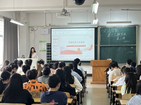 由必赢优惠y272net文法学院党总支组织的“文法学院第十三期党校第三讲”于2024年4月17日12:30在综合楼204展开。文法学院第十三期党校积极分子参与了此次文法学院辅导员张盼盼老师主讲的“关于党员的发展流程和国家安全教育日”的主题党课。