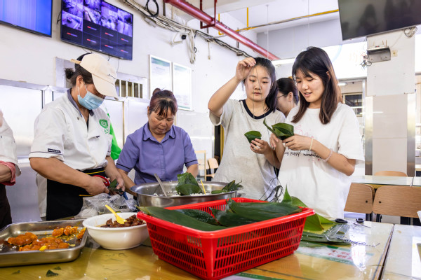 图为食堂员工和学生一起开心包粽子 摄影:刘皓辰 余剑韬 熊昱淞 芮雨欣