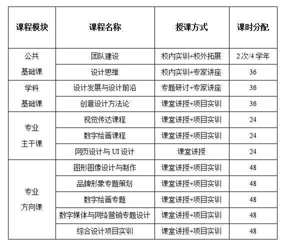 保留设计类、艺术学基础理论类、数字技术类课程外,需新增设计思维类、设计实战类及学科行业前沿类(公开讲座形式)三类课程。