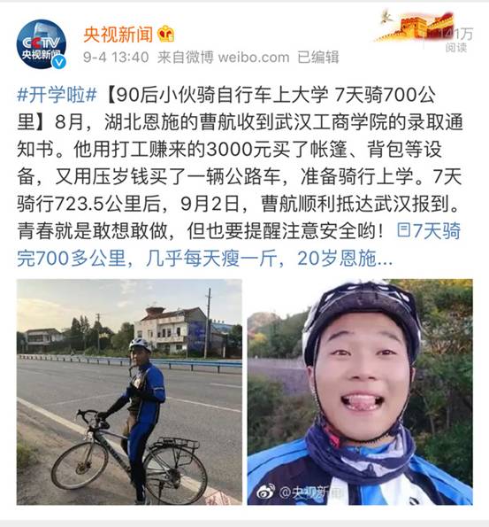 20岁的大一新生曹航,用时7天,独自骑自行车从恩施老家出发,骑完723.5公里,9月2日顺利抵达武汉报到,开启了人生新的篇章。