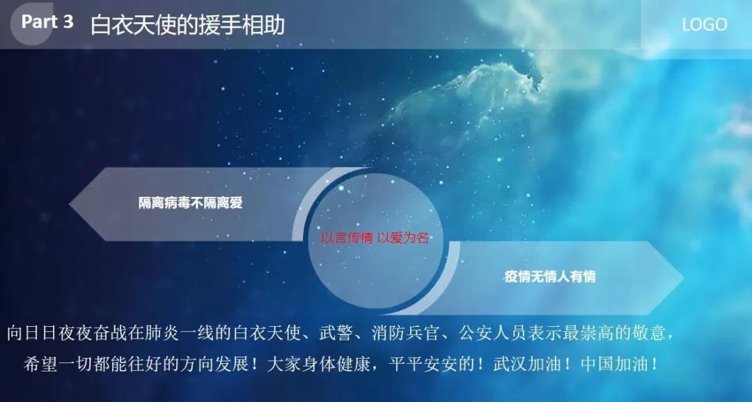 “生命可贵,医护应被崇敬。我所制作的PPT为新型冠状病毒致敬最美逆行者。没什么岁月静好,只是有人替我们负重前行。大年初一,医护人员依旧忙碌,在救死扶伤、安全保卫的第一线,坚守自己的岗位,他们用“舍”和“守”撑起百姓的安康,为人民的健康保驾护航,抗击疫情,他们一直准备着。”