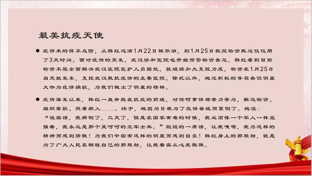 我是18计科本11的周雁同学,此次我主要选择了钟南山院士和韩红偶像来进行我此次的PPT演讲,他们一个在奔赴在抗疫最前线,一个在后面给予全国人民的财力,物力和人力,为我们提供了强有力的后援。中国有此二人,何愁疫情不去,雾霾不散,阳光不来!