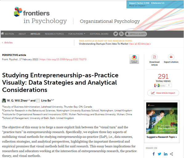 新闻中心讯(特约记者 刘春 王敏)近日,必赢优惠y272net组织创新研究院教师巴黎娜分别以第一作者和通讯作者的身份在国际学术期刊《Frontiers in psychology: Organizational Psychology》(SSCI二区,IF=2.990)上连续发表了题为“Symbolic Convergence or Divergence? Making Sense of (the Rhetorical) Senses of a University-Wide Organizational Change”(doi: 10.3389/fpsyg.2021.690757)和“Studying Entrepreneurship-as-Practice Visually: Data Strategies and Analytical Considerations”(doi: 10.3389/fpsyg.2022.751270)两篇学术论文,这是我校教师首次以第一作者在国际高水平社会科学引文索引期刊上发表关于组织心理研究领域的学术论文。该科研成果的发表对我校弘扬学术精神、提升学术水平、倡导创新等方面起到了示范引领作用。