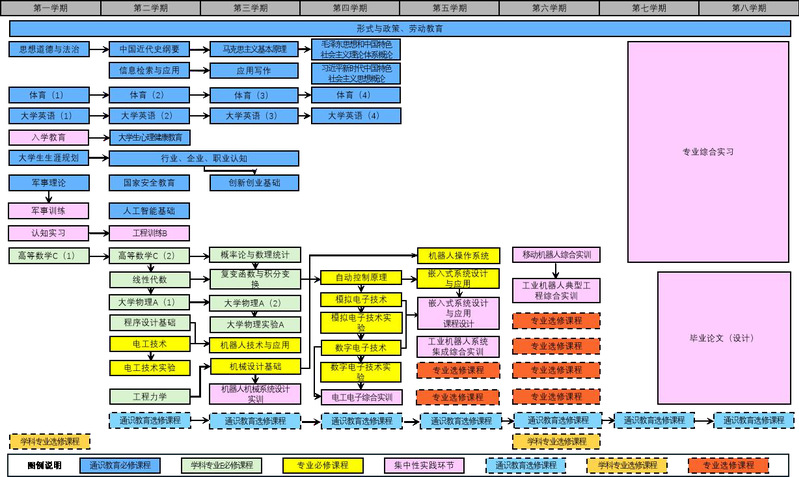 专业核心课程:机械设计基础、电工技术、数字电子技术、模拟电子技术、嵌入式系统设计与应用、自动控制原理、机器人技术与应用、机器人操作系统