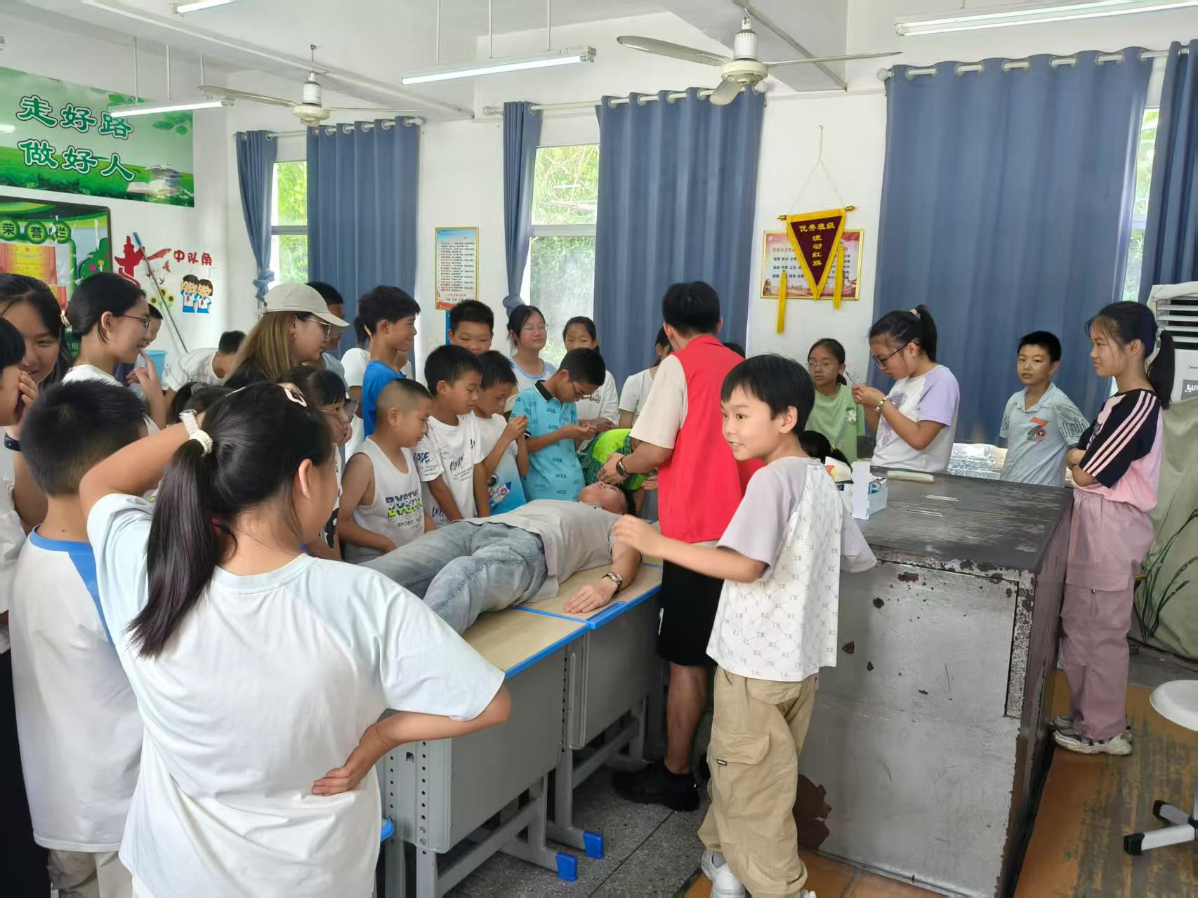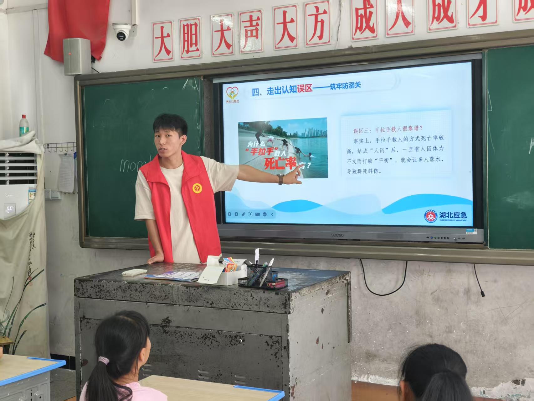 与此同时,欧阳龙和李家兴在托管二班开展了防溺水的安全教育课堂。首先欧阳龙给同学们讲解了如何识别危险水域,以及为什么野外水域会危险。紧接着讲解了不慎落入水中的自救方法,还有当别人落水时我们该如何施救。最后给大家例举了一些常见的关于溺水的误区。课堂上欧阳龙还与他的助教李家兴亲自展示了紧急救援方法。同学们也是积极地在一旁观望学习。