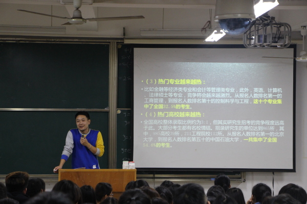 他也向大家分析了未来几年的“四个考研热门”,即:热门专业硕士、热门城市、热门专业、热门高校。最后,他真诚地为2020年考研的学生们送上了备考箴言:背好单词、刷好真题、耐好寂寞。