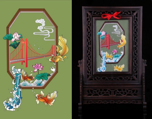 非遗汉绣团队目前已开发出十个主题共100款原创汉绣装饰图案样稿,该项目内部分原画作品已经在第二届长江非物质文化遗产大展上展出。数款该项目内图案应用的文创产品也即将面世。这些汉绣作品简洁、美观且具有强烈的楚文化特点,具有审美和文化传承等多重价值。例如其中的一件作品《流连鹦鹉洲屏风》,按瀑布左前、鹦鹉洲大桥主体居中、装饰云纹右后布局,分近景中景远景,画面具空间感,延伸性。分布均衡、和谐、美观。据团队指导老师程奇老师介绍,这款《流连鹦鹉洲屏风》图案元素包含由武汉新文化标志性建筑鹦鹉洲大桥与装饰性水浪、云纹、荷花、荷叶、灵动的金鱼融合在一起,自然和谐。